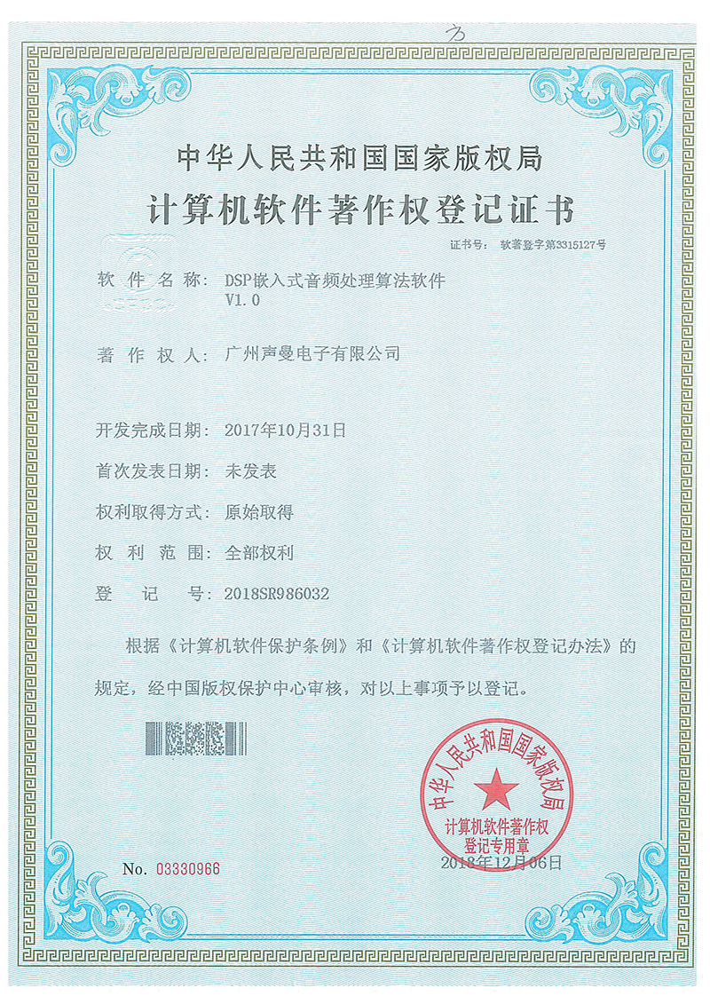 计算机软件著作权登记证书(DSP嵌入式音频处理算法软件V1.0) -